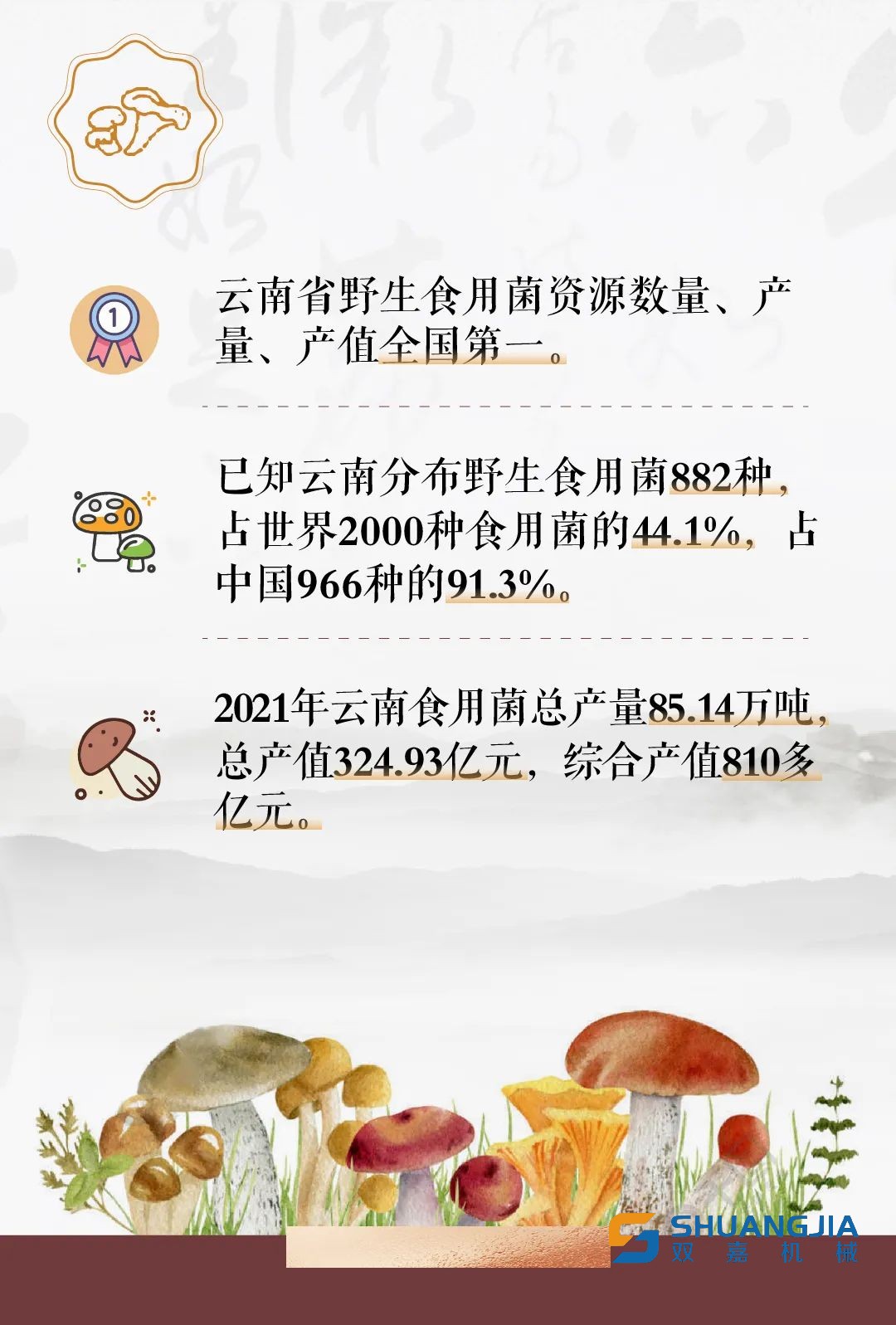 2021年,云南全省野生食用菌產(chǎn)量28.04萬(wàn)噸,產(chǎn)值211.13億元;栽培食用菌規(guī)模逐步發(fā)展,年產(chǎn)量57.1萬(wàn)噸,農(nóng)業(yè)產(chǎn)值113.8億元;云南食用菌總產(chǎn)值全國(guó)排名第二位,出口創(chuàng)匯連續(xù)20多年超過(guò)1億美元。